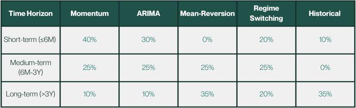 This dynamic weighting scheme reflects empirical evidence that momentum factors dominate short-term returns, while mean reversion and historical fundamentals assert greater influence over extended horizons. For component level specifications see Appendix 1.