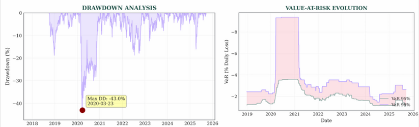 The historical drawdown profile underscores the portfolio's resilience through market stress scenarios. The 2020-2021 maximum drawdown of approximately 40% during the pandemic shock has informed the current risk budgeting framework, leading to enhanced diversification across uncorrelated thematics. The subsequent recovery trajectory demonstrates the portfolio's inherent mean-reversion characteristics and validates the systematic rebalancing methodology. Current drawdown levels near historical lows suggest favorable risk taking conditions, supporting the strategic decision to maintain higher equity exposure while implementing dynamic hedging overlays. The stability exhibited from 2024 forward reflects the maturation of the risk management framework and improved sector correlation dynamics.